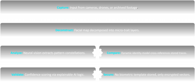 Falconir — embedded within Arqent Core — applies human-inspired AI to interpret individuals by distinctive visual traits, not stored biometrics. From micro-expressions to spatial patterns, it achieves human-level recognition even under disguise or distortion, operating securely within the Arqent Core environment. *GOV only